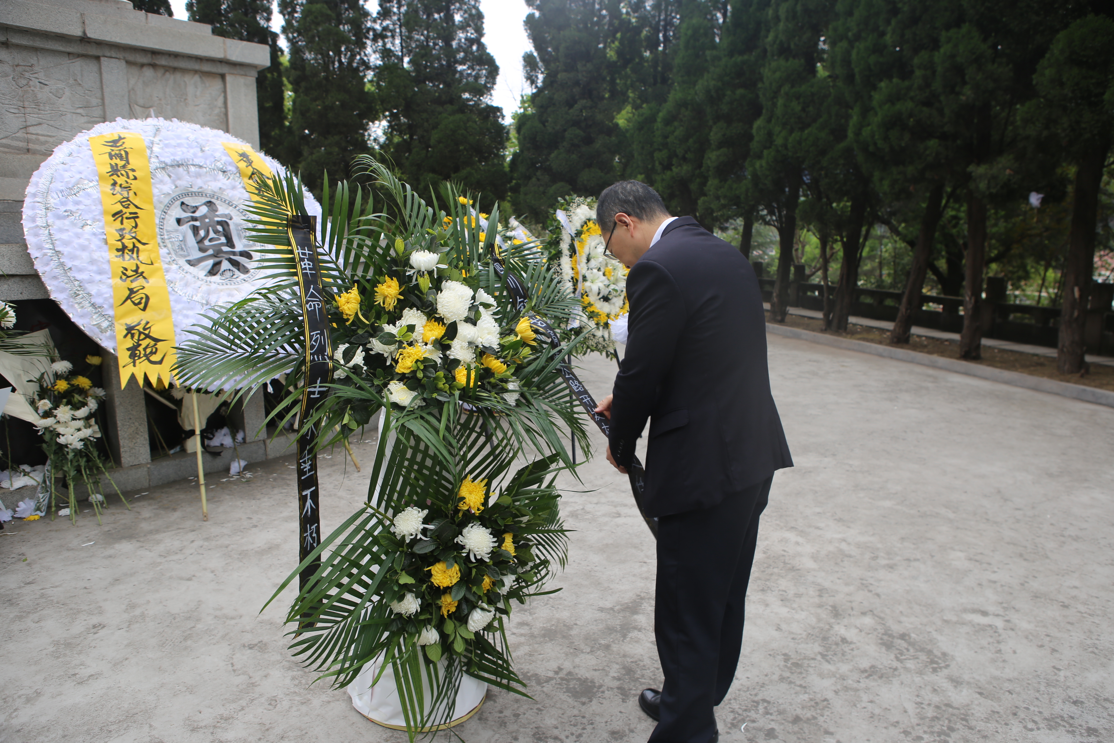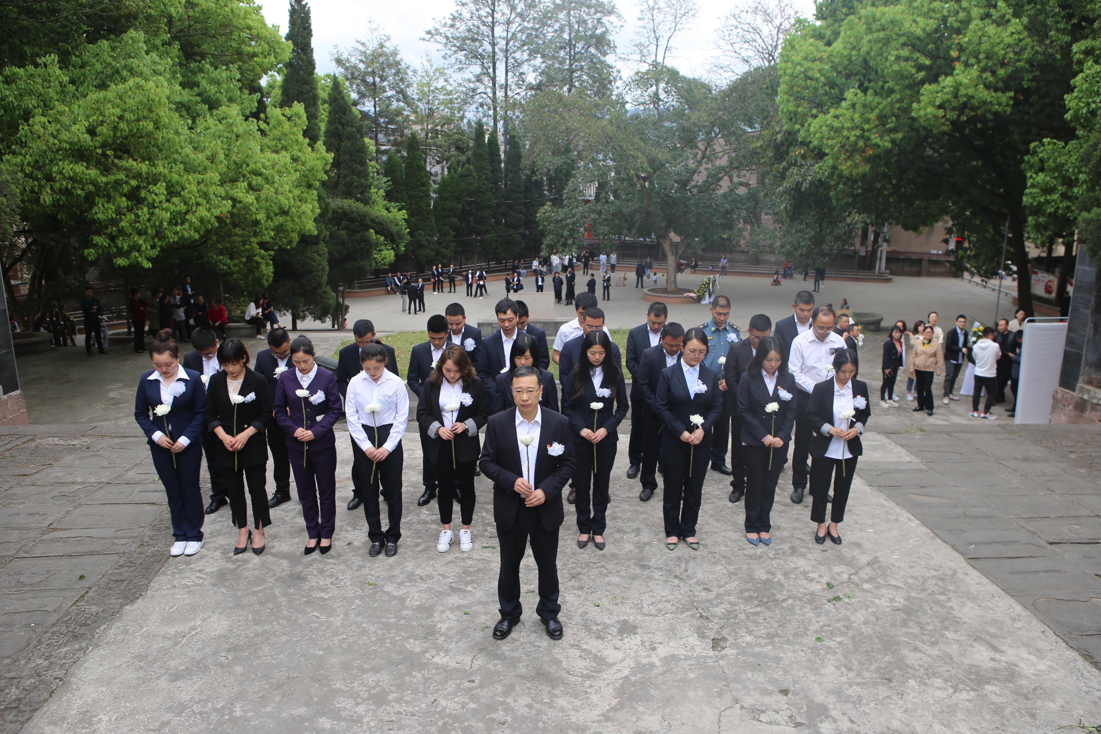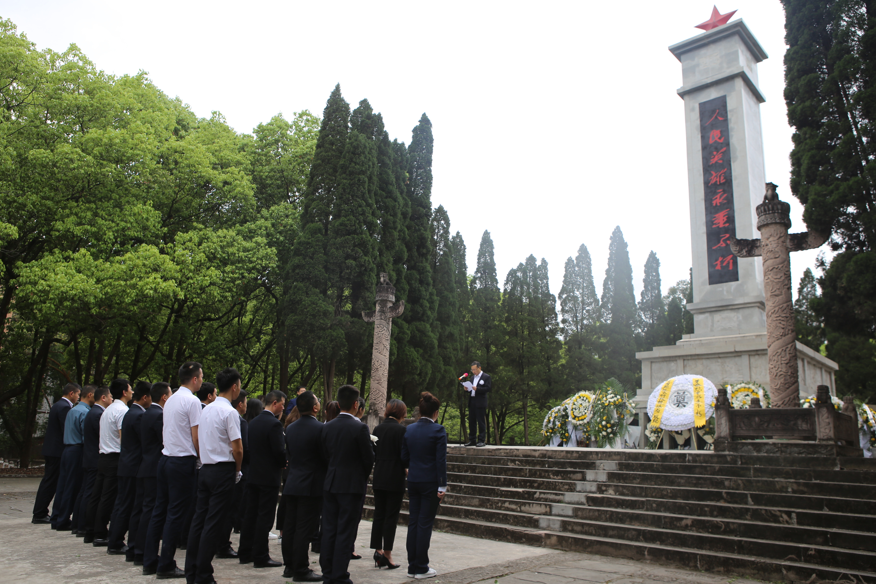 烈士墓前,在公司黨委副書記、總經理喬勝俊的主持下,黨員干部們在紀念碑前齊聲合唱《義勇軍進行曲》、聆聽烈士英雄事跡、為英烈默哀,最后黨委書記、董事長劉小波與兩名黨員代表一起為英烈敬獻花籃、整理挽聯,寄托大家對先烈的緬懷和哀思。