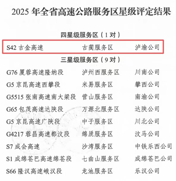 【喜報】古金高速古藺服務區成功斬獲2025年度四川省唯一“四星級服務區”榮譽稱號