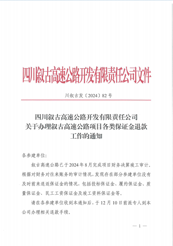 敘古公司關(guān)于辦理敘古高速公路項目各類保證金退款工作的通知